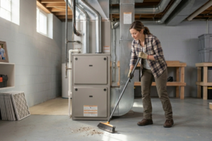 Winter can bring extra dust, storage items, and clutter into basements or utility areas where furnaces are often located. Before shutting the system down, take a few minutes to clear the area around your furnace. Keeping the space clean and unobstructed helps improve airflow and ensures the system remains accessible for future maintenance.